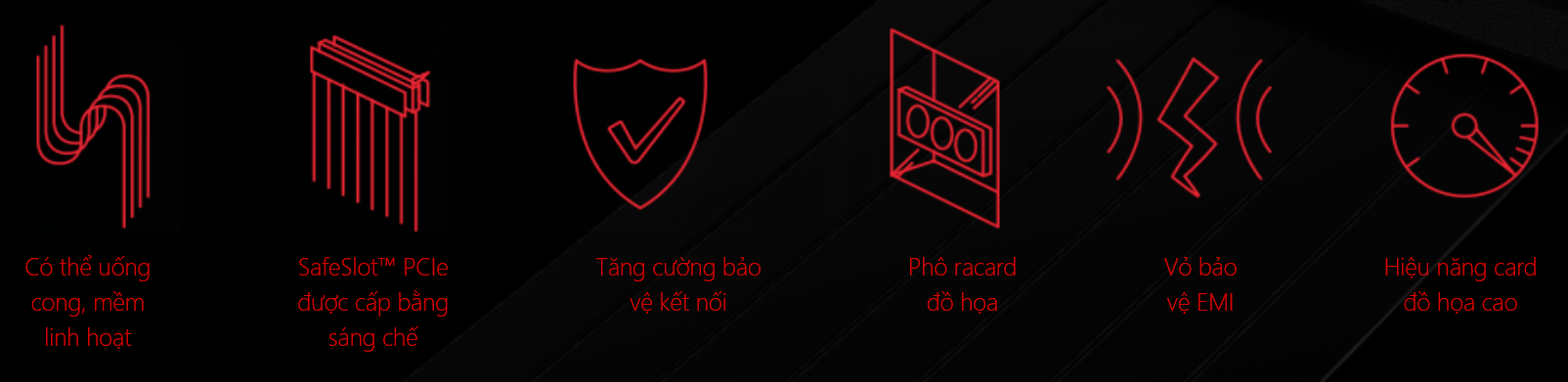 -SafeSlot PCI-E đã được cấp bằng sáng chế của ASUS: Với quy trình sản xuất mới bao gồm các bọc kim loại gia cường và điểm hàn bổ sung, SafeSlot đảm bảo kết nối card đồ họa của bạn chắc và bền. -Có thể uốn, mềm linh hoạt và hiệu quả: Thiết kế mỏng, dẹt và có thể gấp lại được cho hiệu suất và độ ổn định truyền tải và quản lý cáp dễ dàng. -Vỏ bảo vệ EMI: Chống nhiễu và giảm hiệu năng hao hụt -Kích thước :240 x 127 x 10 mm (LxWxH) -Giao diện :PCI-E 3.0 x16 -Màu: ĐenTHÔNG SỐ KỸ THUẬT