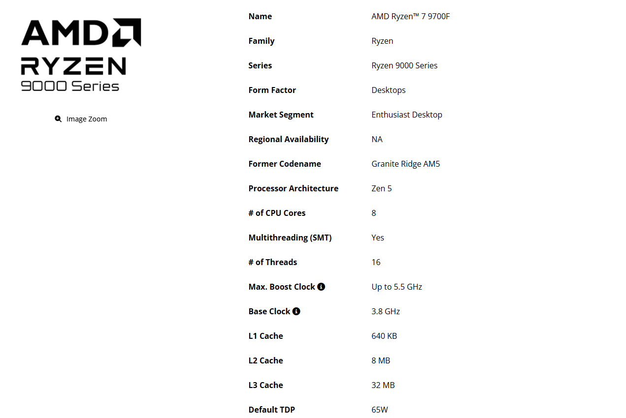 Trang web chính thức của Ryzen 7 9700F cũng đã ra mắt nhưng nó vẫn chưa có mặt trong danh sách Ryzen 9000 series trên trang web của AMD. Nhìn chung, thông số kỹ thuật của CPU AMD Ryzen 7 9700F gần như tương tự so với Ryzen 7 9700X, đều có 8 nhân 16 luồng, xung nhịp cơ bản 3.8GHz và xung nhịp tối đa lên tới 5.5GHz với 32MB bộ nhớ đệm L3 và TDP khoảng 65W, nhưng nó sẽ không có đồ họa tích hợp.