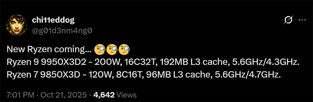 Theo nguồn tin này, CPU AMD Ryzen 9 9950X3D2 sẽ sở hữu 16 nhân 32 luồng và dự kiến sẽ được định vị là chip Zen 5 "Ryzen 9000" hàng đầu. CPU này được cho là hoạt động ở mức TDP 200W với bộ nhớ đệm lên tới 192 MB và sẽ giữ nguyên xung nhịp cơ bản 4.30 GHz, nhưng xung nhịp tăng tốc sẽ được giảm xuống còn 5.6 GHz, giảm 100 MHz so với 9950X3D và 9950X. Trong khi đó, Ryzen 9 9950X3D cung cấp 16 nhân, 32 luồng, với xung nhịp boost lên đến 5,7 GHz ở mức 170W và bộ nhớ đệm L3 tổng cộng 128 MB. Điều này đạt được nhờ một CCD được tăng cường X3D với 64 MB bộ nhớ đệm 3D V-Cache và 32 MB bộ nhớ đệm on-CCD, trong khi CCD thứ hai đi kèm với bộ nhớ đệm on-CCD tiêu chuẩn 32 MB. Tuy nhiên, phiên bản 16 nhân mới hơn được cho là cũng tích hợp thêm 64 MB trên đế chip thứ hai, đạt tới 192 MB bộ nhớ đệm, cao nhất từ trước đến nay trên một CPU máy tính để bàn phổ thông.