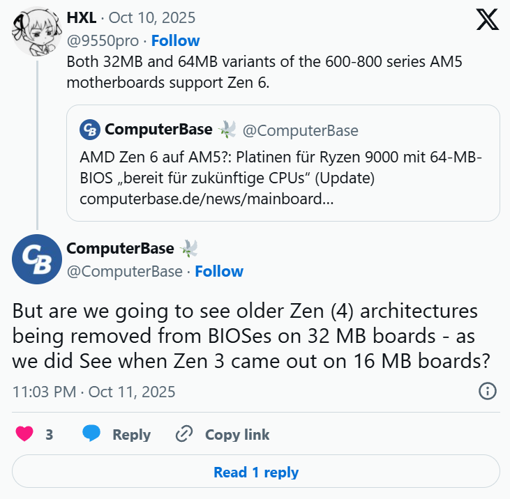 Xem xét các báo cáo trước đây, có vẻ như các bo mạch chủ AM5 hiện tại cũng sẽ tương thích với Zen 6, chính xác như những gì @9950Pro (HXL) - người chuyên rò rỉ thông tin nổi tiếng - đã đưa tin về X. Vì báo cáo này không phải là chính thức, hãy cẩn thận khi xem xét thông tin này. HXL đã báo cáo rằng cả bo mạch chủ BIOS 32 MB và 64 MB đều sẽ được Zen 6 hỗ trợ, trả lời Computer Base. Điều này đồng nghĩa với việc cả bo mạch chủ dòng 600 và 800 hiện tại đều tương thích với Zen 6.