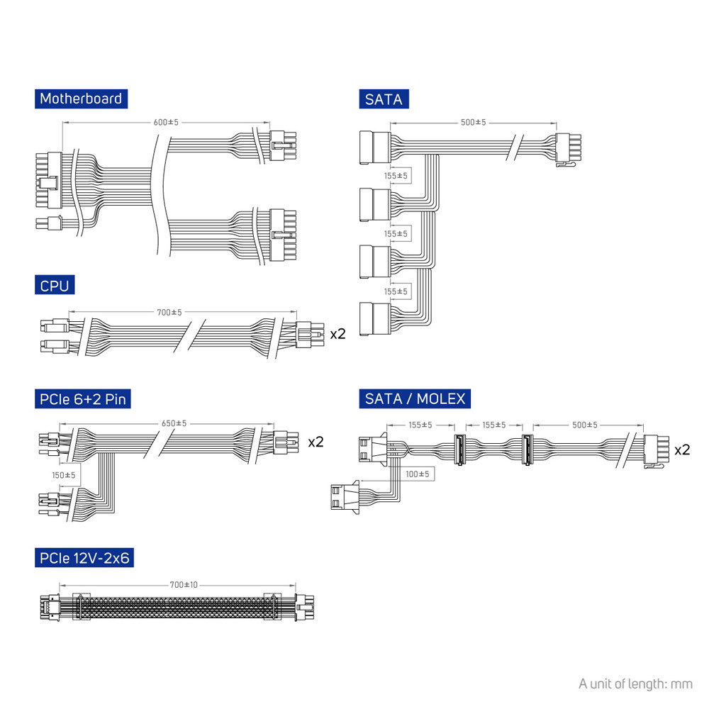 1 x MB 20+4 PIN 2 x CPU 4+4 PIN 4 x PCIe 6+2 PIN 1 x PCIe 12V-2x6 4 x SATA 4 x MOLEX / 4 x SATA |