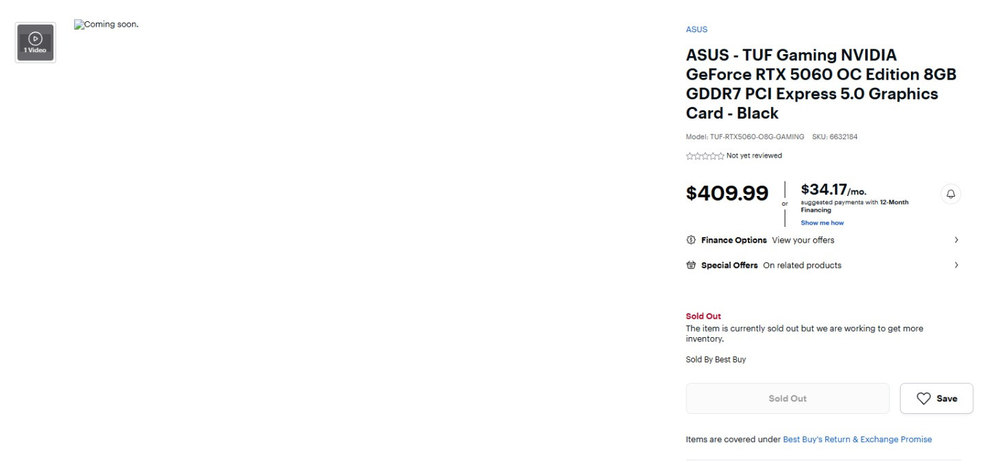 Hai đối tác bo mạch chủ của NVIDIA, cụ thể là ASUS và PNY, đã niêm yết một số sản phẩm card màn hình RTX 5060 8GB của họ trên Best Buy, một nhà bán lẻ lớn của NA, trước khi ra mắt. Nếu bạn còn nhớ, NVIDIA đã ra mắt GeForce RTX 5060 vào tháng trước, với giá 299 đô la, nhưng có vẻ như GPU này sẽ khá đắt đối với ASUS. Có thể vẫn còn quá sớm để nói liệu đây có phải là giá giữ chỗ hay không, nhưng có vẻ như bạn không nhất thiết phải tìm thấy RTX 5060 ở MSRP.